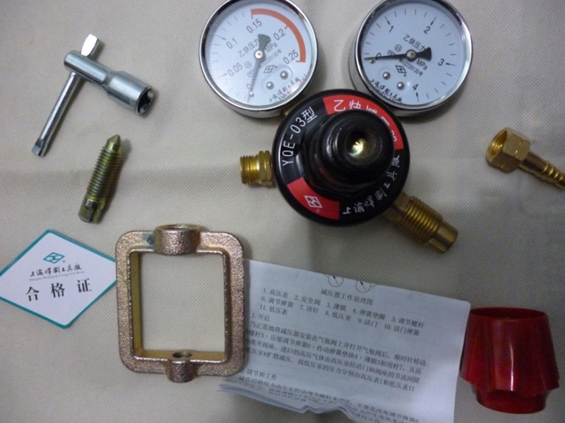 YQE-03乙炔减压器是将乙炔气瓶内的高压乙炔气体减压后供使用的减压装置。主要用于焊接、切割等工业方面。产品在输出压力和出口流量发生变化的工作条下,都能保持稳定的输出压力。