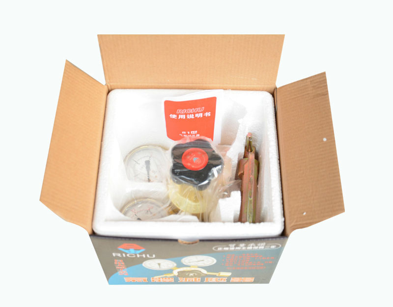 8、要检查是否漏气,先把气瓶阀关好,然后逆时针方向把调节螺杆旋出一圈。如果高压表读数减小,那么就是减压器高压部分或气瓶阀漏气。如果低压表读数减小,那么就是减压器低压部分或减压器后面的管路及设备漏气。如果高压表读数减小,同时低压表读数上升,那么说明减压器阀座处漏气。以上漏气均可用检漏效果良好并安全的溶液检漏。